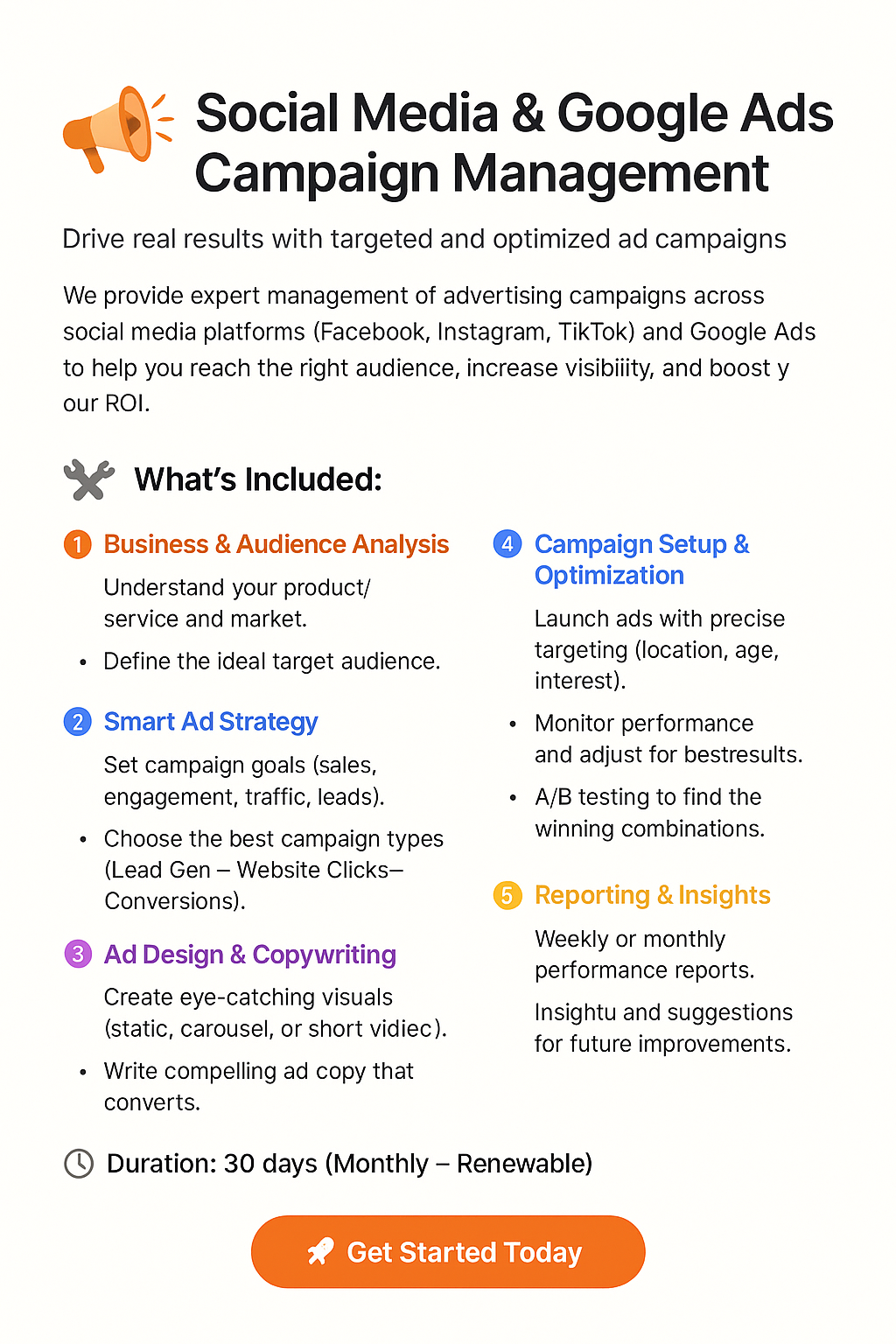 We provide expert management of advertising campaigns across social media platforms (Facebook, Instagram, TikTok) and Google Ads to help you reach the right audience, increase visibility, and boost your ROI.